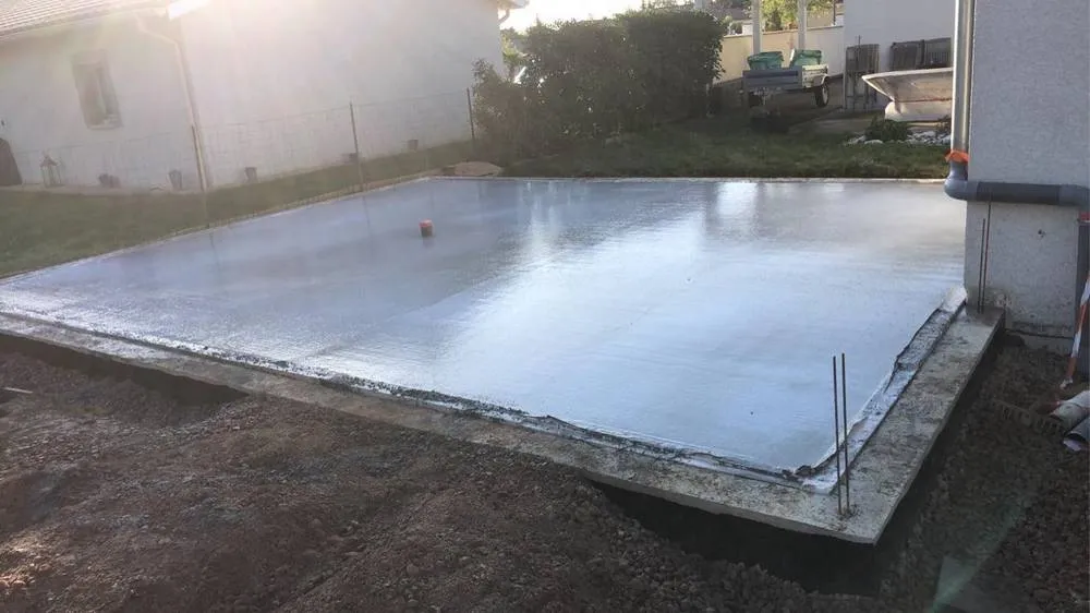 Le coulage s’effectue en répartissant le volume de béton sur toute la surface délimitée. Nos maçons veillent à homogénéiser le mélange de ciment, sable, eau et gravier, puis procèdent au bétonnage avec vibration mécanique afin d’éliminer les bulles d’air. À l’aide d’une règle métallique, nous nivelons soigneusement la dalle pour atteindre le niveau prévu.